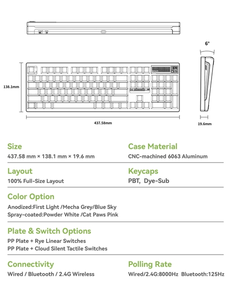 - 3 chế độ kết nối: Kết nối dây (USB Type C), Bluetooth, 2.4 GHz