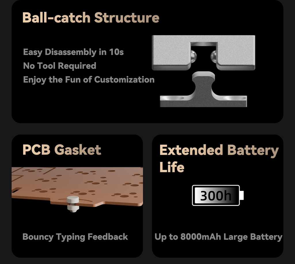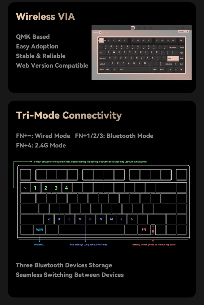 - Bridge75 Plus: 1.2mm flex cut, Hotswap, 3 mode, LED RGB, phần mềm keymap VIA