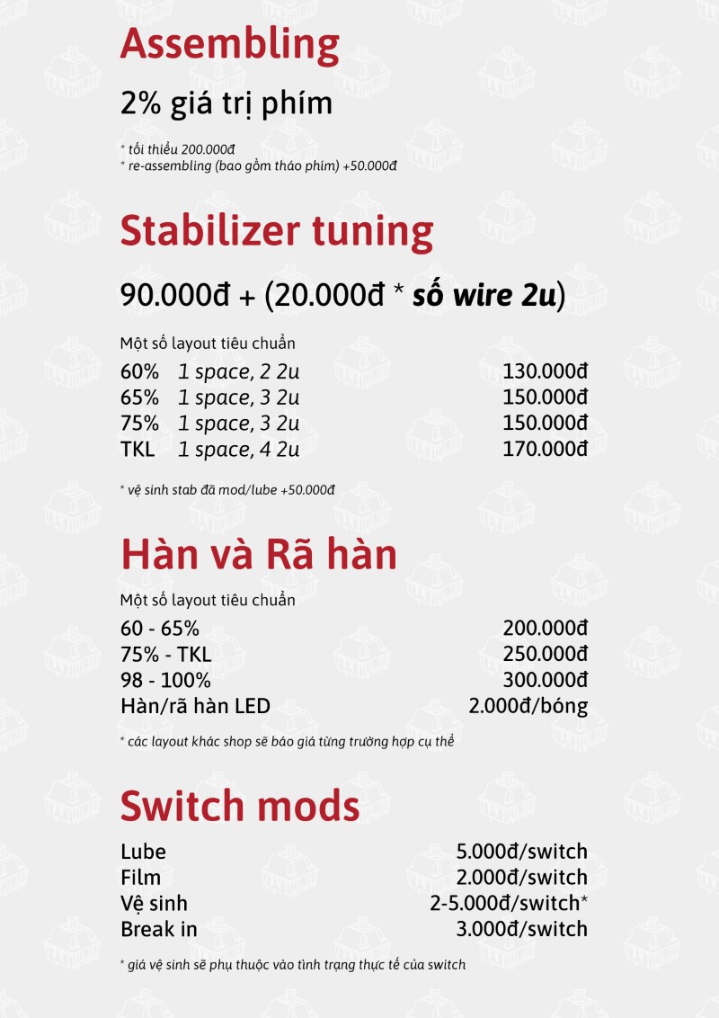 Quan trọng hơn, phí lắp ráp còn bao gồm "bảo hiểm rủi ro", cam kết bảo vệ kit bàn phím của bạn (đặc biệt là những sản phẩm giá trị cao) khỏi các hư hỏng hy hữu trong quá trình lắp ráp.