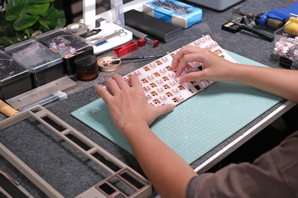 - Bôi trơn (Lubing): Dùng mỡ chuyên dụng (Krytox 205g0, XHT-BDZ) bôi trơn các điểm tiếp xúc, mang lại cảm giác mượt mà và triệt tiêu tạp âm.