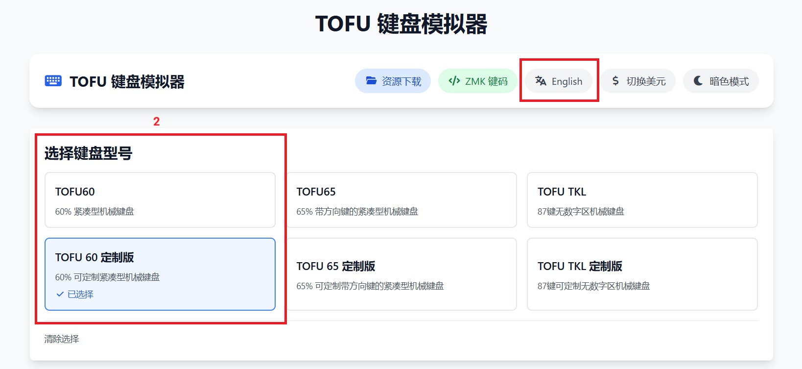 Bước 1: Bạn hãy truy cập địa chỉ: https://kbd.tools/. Đổi ngôn ngữ sang tiếng Anh để dễ lựa chọn. Sau đó, chọn "TOFU 60" trong danh sách bàn phím.