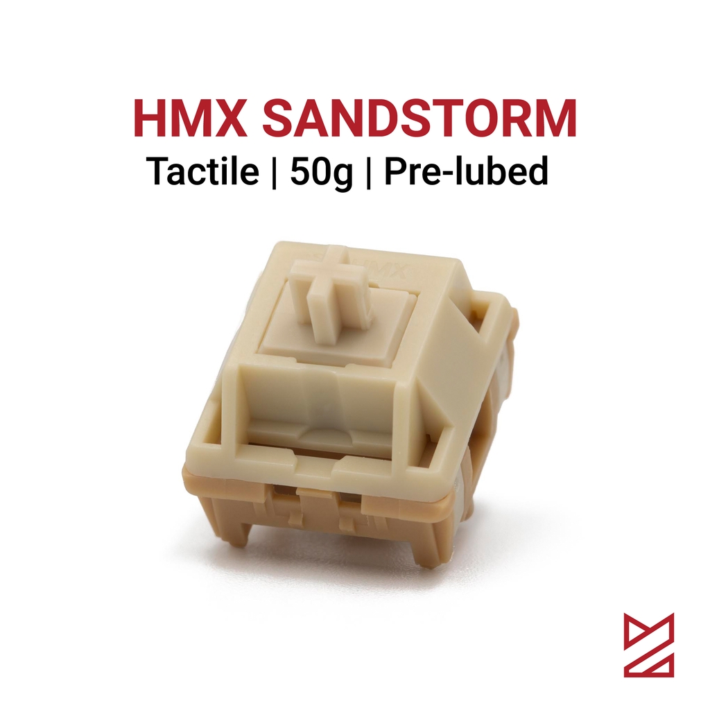 Sandstorm là một switch tactile có khấc lớn do HMX sản xuất, mang đến trải nghiệm gõ cực kỳ dứt khoát và rõ ràng. Với hành trình ngắn, switch gần như không có cảm giác pre-travel và post travel. Sự kết hợp giữa chất liệu POM ở stem, PC ở top housing, và PA66 ở bottom housing mang lại âm thanh to, đanh và giòn, đặc trưng của HMX. HMX Sandstorm cũng sử dụng khuôn top mới nhất của HMX, giúp giảm thiểu hiện tượng trì và dính ở đầu hành trình, mang lại cảm giác gõ mượt mà