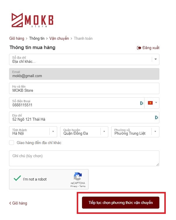 - Các bạn điền địa chỉ nhận hàng (có thể tạo tài khoản và lưu địa chỉ trong sổ địa chỉ). Sau đó bấm "Tiếp tục chọn phương thức vận chuyển"