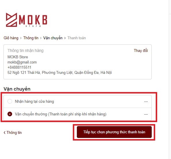 - Bạn chọn hình thức vận chuyển mong muốn sau đó ấn "Tiếp tục chọn phương thức thanh toán"