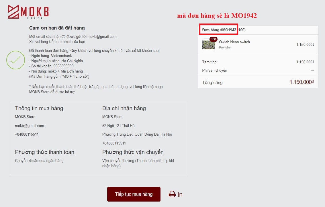 Vậy là bạn đã hoàn tất việc đặt hàng, và bạn sẽ có mã đơn hàng là MO + 4 chữ số (ví dụ trong hình là MO1942)