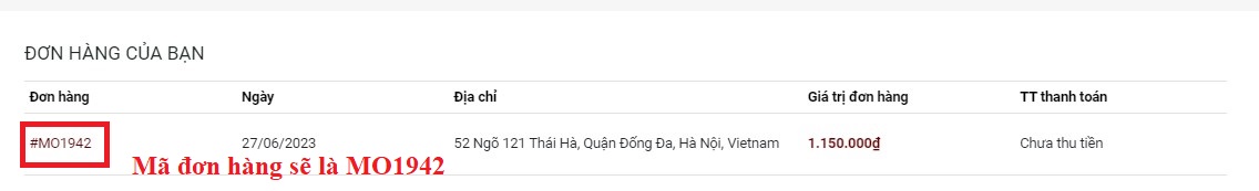 - Đơn hàng được ghi nhận là thành công khi có mail Xác nhận đơn hàng và trong mục Đơn hàng của bạn như sau (mã đơn hàng sẽ có là MO + 4 số ví dụ trong hình là MO1942)
