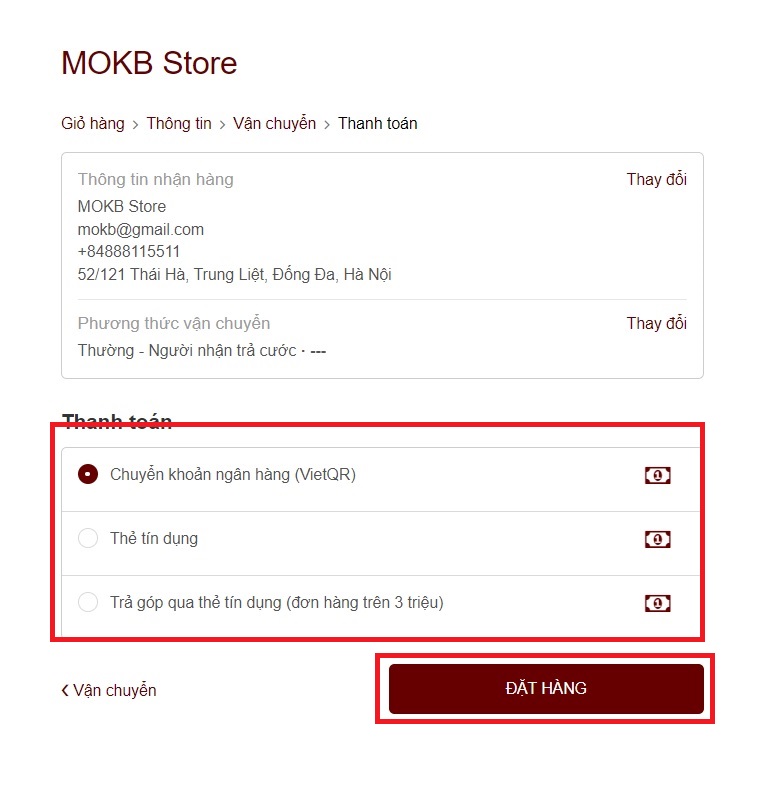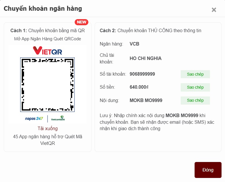 - Chuyển khoản ngân hàng (VietQR) - Sau khi ấn đặt hàng sẽ sẽ có mã QR để quét và thanh toán. Hoặc bạn có thể chuyển khoản theo hướng dẫn và nhập nội dung chuyển khoản: MOKB + "dấu cách" + Mã đơn hàng. Ví dụ: MOKB MO1008