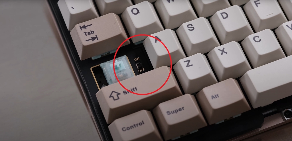 Evo80 được trang bị 2 viên pin 4000mAh, công tắc pin đặt gần vị trí caps lock, bạn cần tháo keycap ra để bật tắt công tắc này
