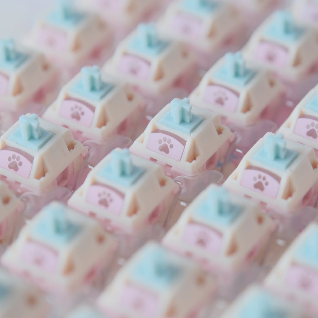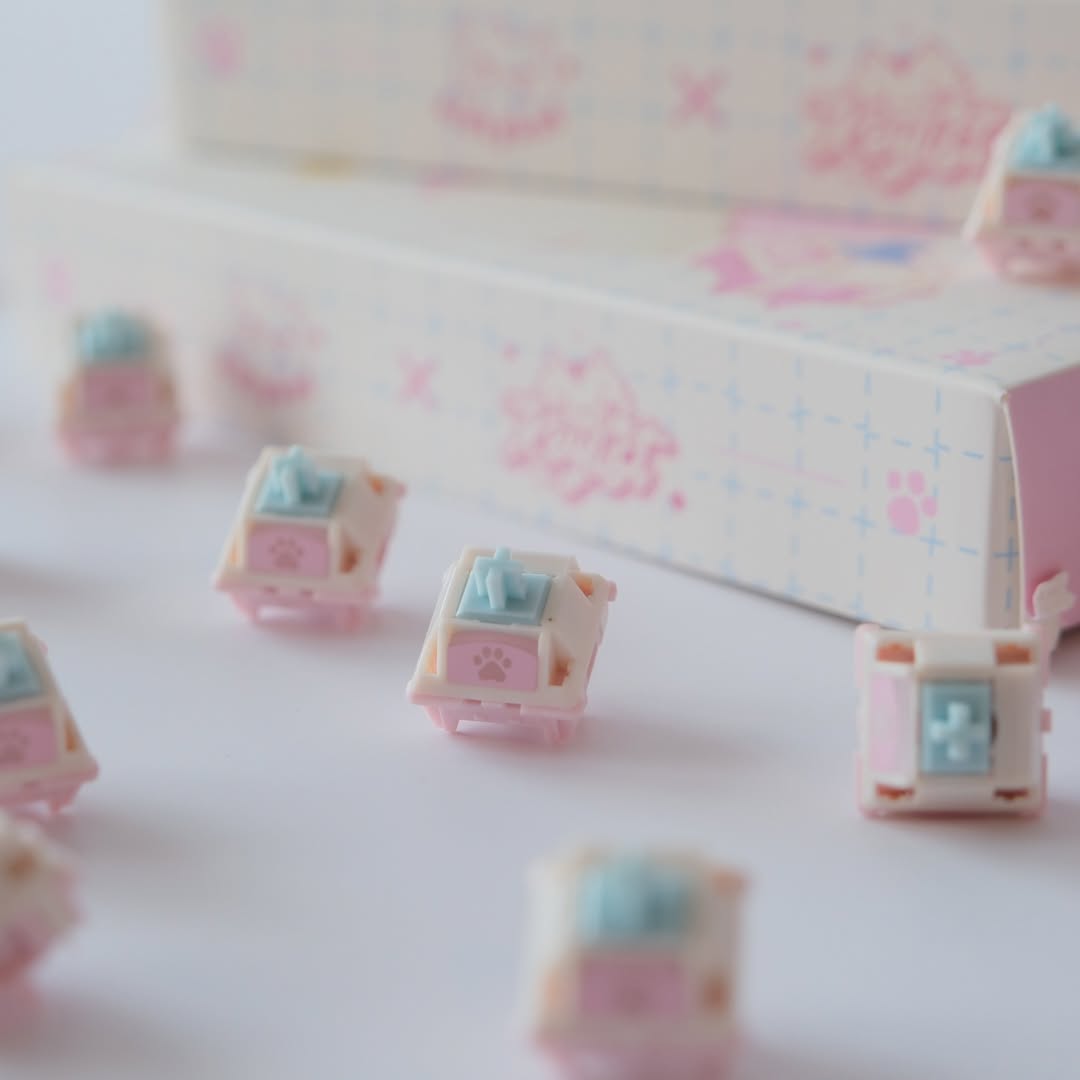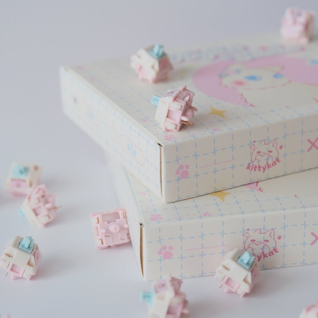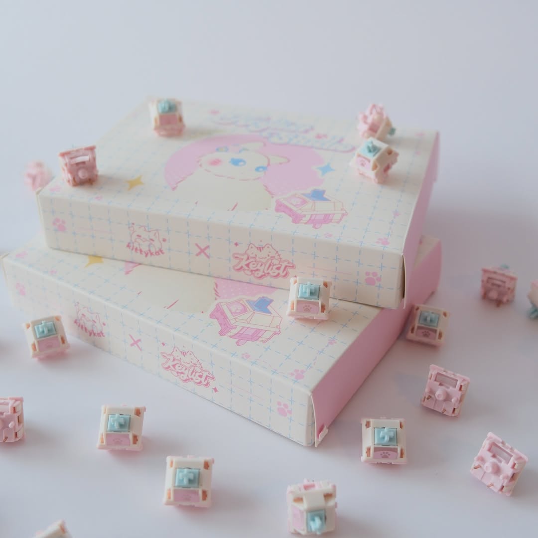 Switch Kitty là sản phẩm hợp tác giữa Keylist Studio và Kittykat.keys, nổi bật với sự kết hợp của các tông màu pastel xanh, trắng và hồng vô cùng dễ thương. Hoạ tiết chân mèo đáng yêu được in UV trên tản LED, mang lại vẻ ngoài xinh xắn dù bạn có dùng LED RGB hay không. Switch mang lại một chất âm đặc trưng trầm ấm, có phần hơi đục nhờ sử dụng stem HPE với hành trình 3.7mm.