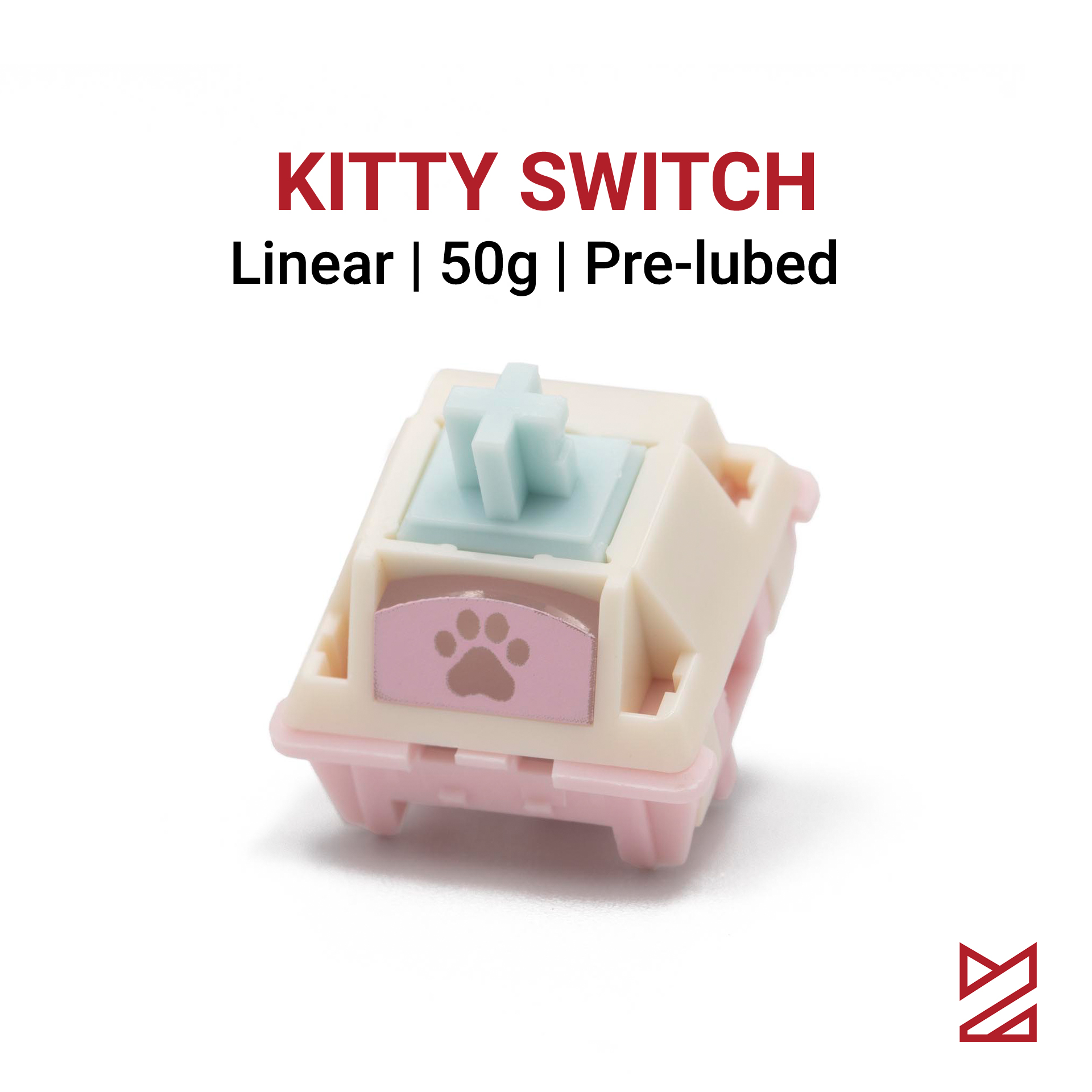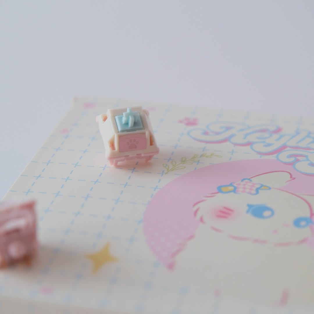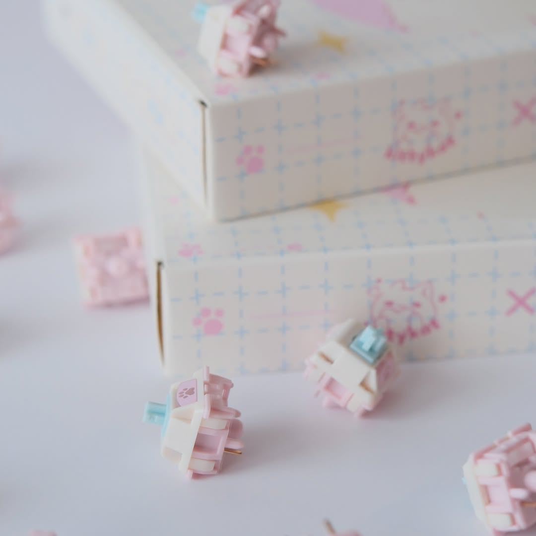 Switch Kitty là sản phẩm hợp tác giữa Keylist Studio và Kittykat.keys, nổi bật với sự kết hợp của các tông màu pastel xanh, trắng và hồng vô cùng dễ thương. Hoạ tiết chân mèo đáng yêu được in UV trên tản LED, mang lại vẻ ngoài xinh xắn dù bạn có dùng LED RGB hay không. Switch mang lại một chất âm đặc trưng trầm ấm, có phần hơi đục nhờ sử dụng stem HPE với hành trình 3.7mm.