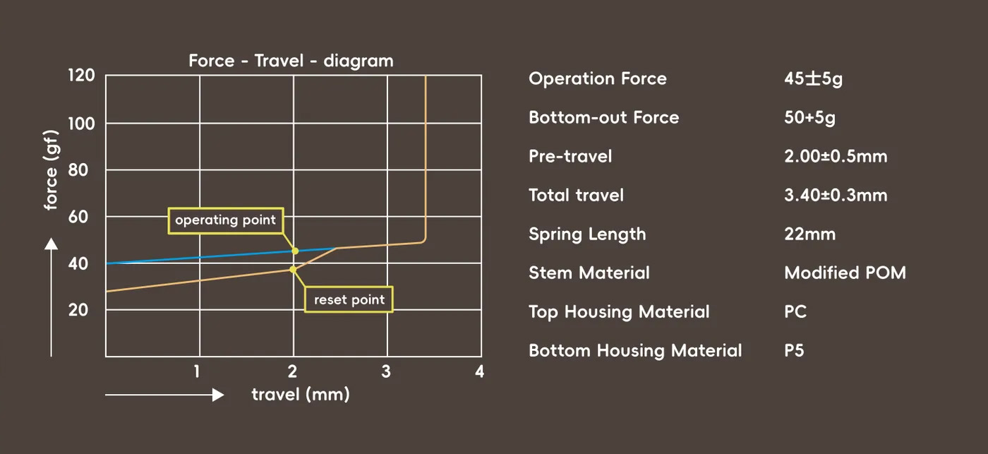 • Lực lò xo: 45±5 gf Kích hoạt - 50±5 gf Bottom out
