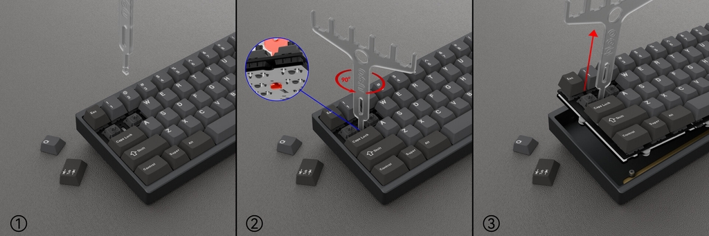 Khi bạn cần tháo rời bàn phím sau khi đã hoàn thành build, bạn chỉ cần tháo keycap ở phía trên khe tháo rời, cắm dụng cụ vào và kéo nhẹ nhàng PCB và plate ra khỏi vỏ. Phương pháp đơn giản này giúp công việc tháo rời phím trở nên cực kỳ dễ dàng.