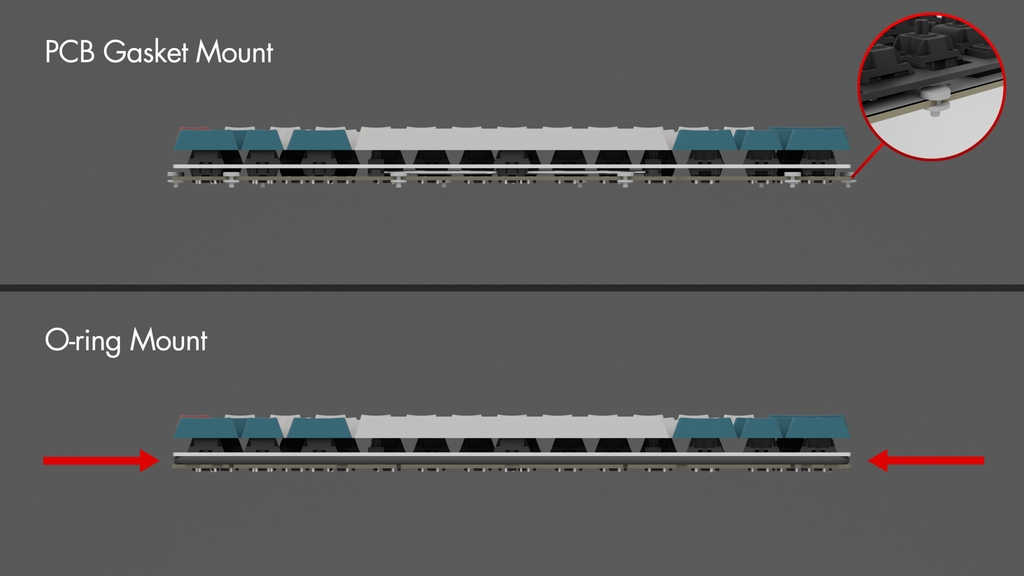 - O-ring mount: Kiểu mount này sẽ cố định PCB và plate một cách chắc chắn, đồng thời mang lại khả năng cách âm các phím ở cạnh bàn phím, từ đó mang đến cảm giác gõ và âm gõ nhất quán hơn.
