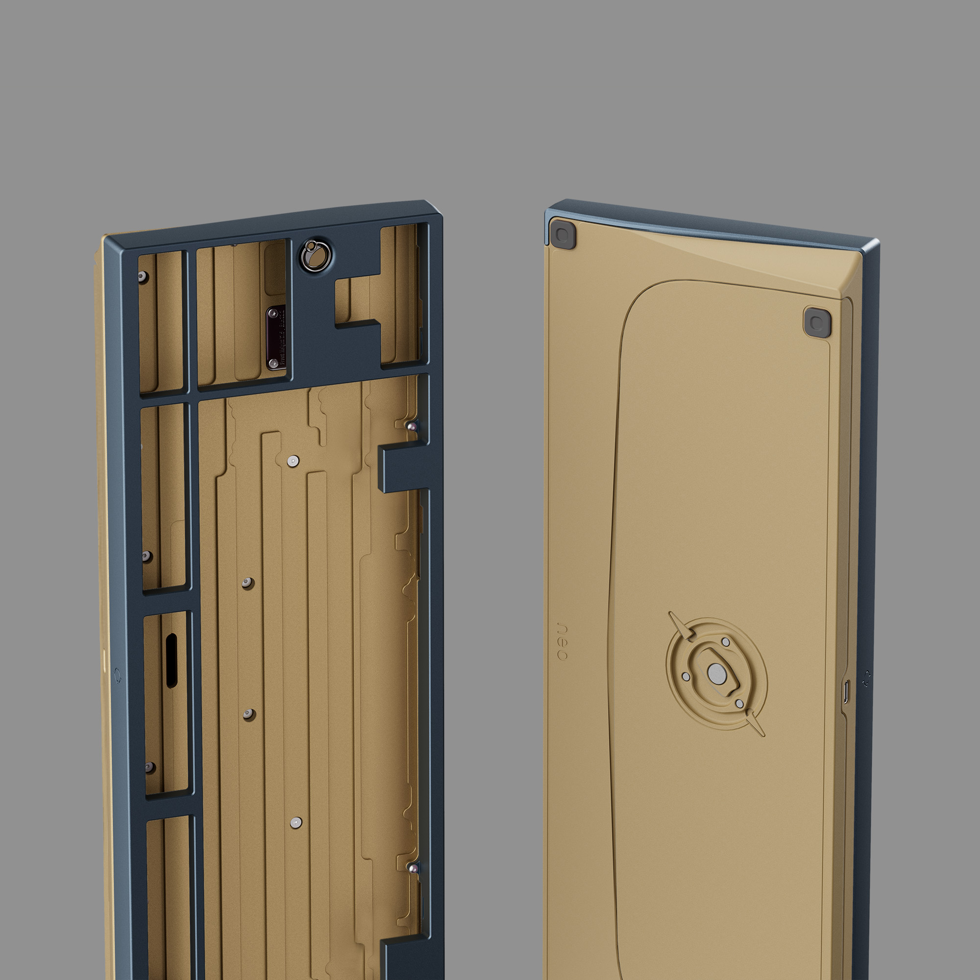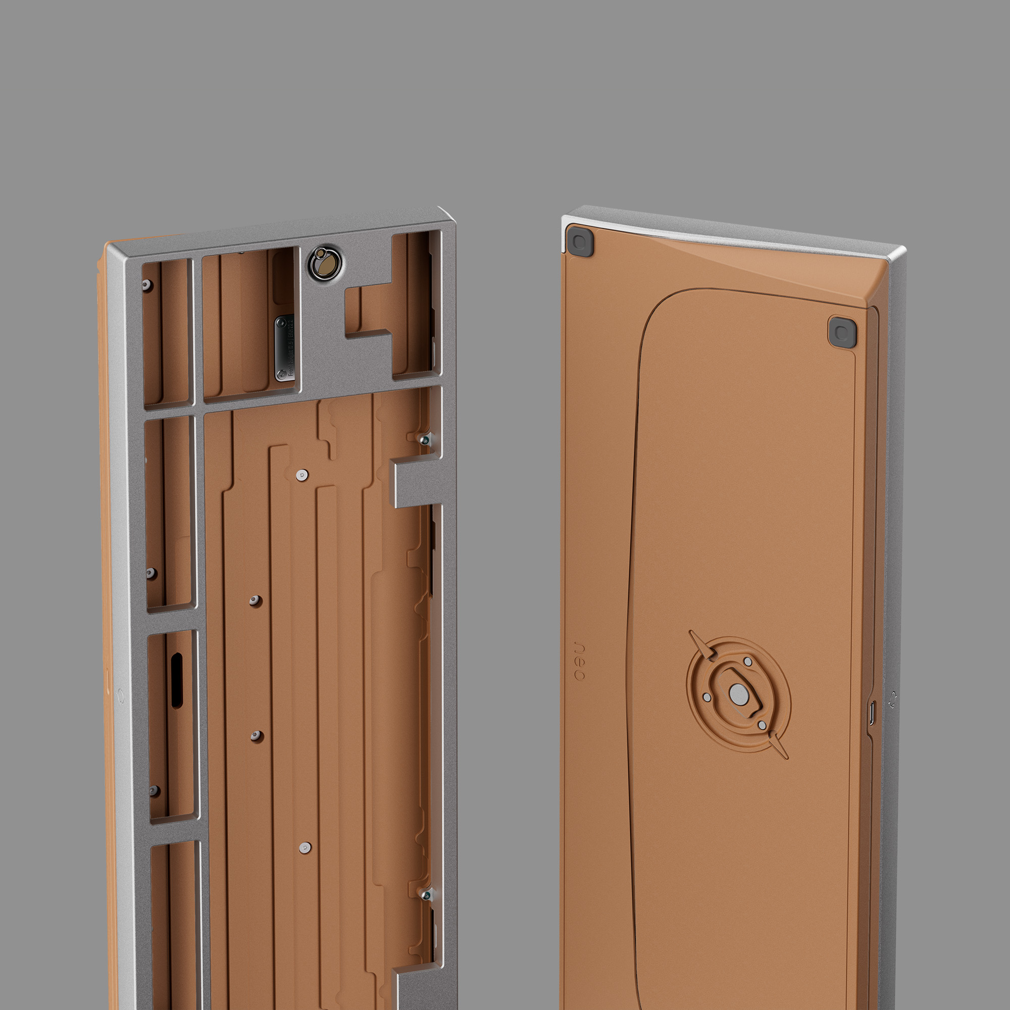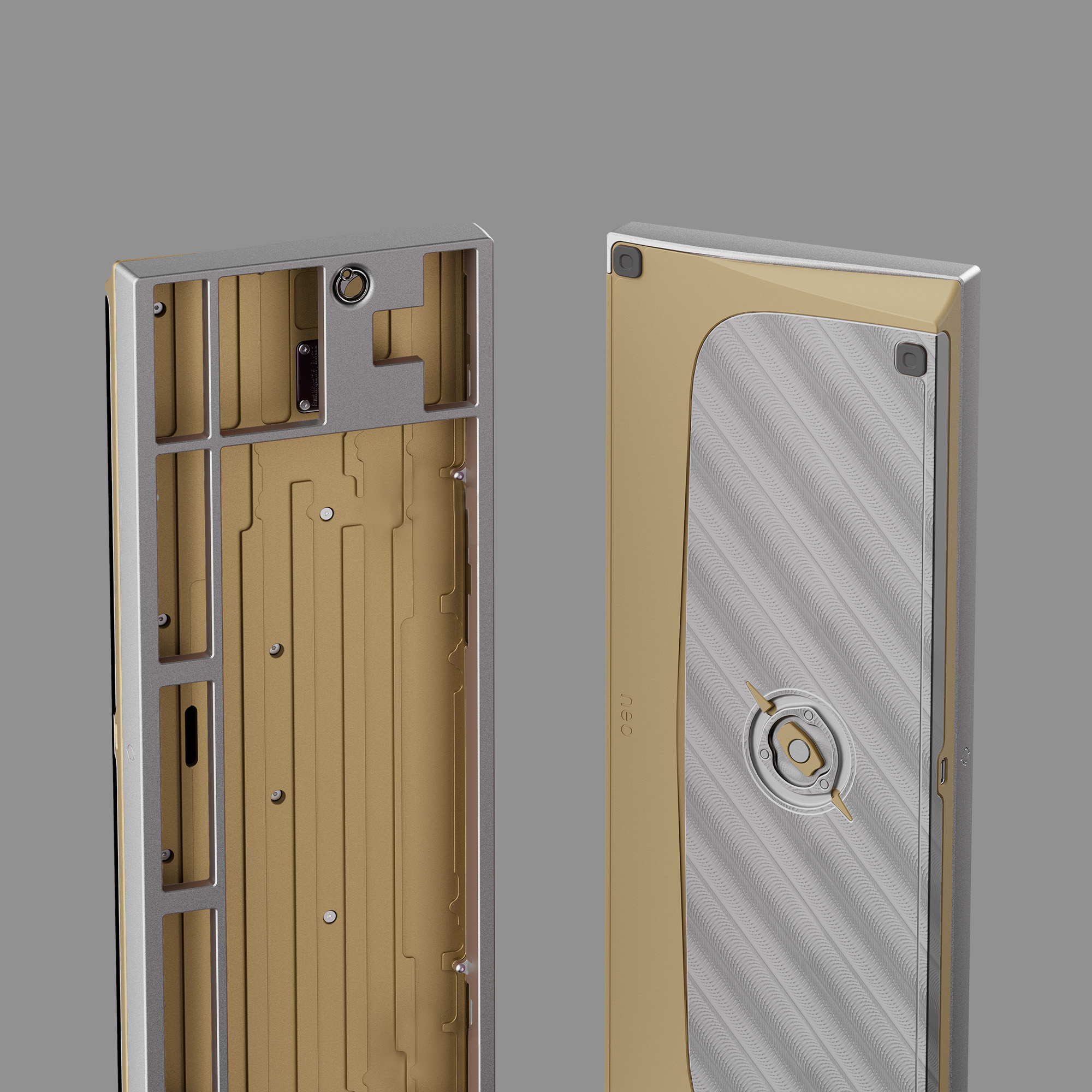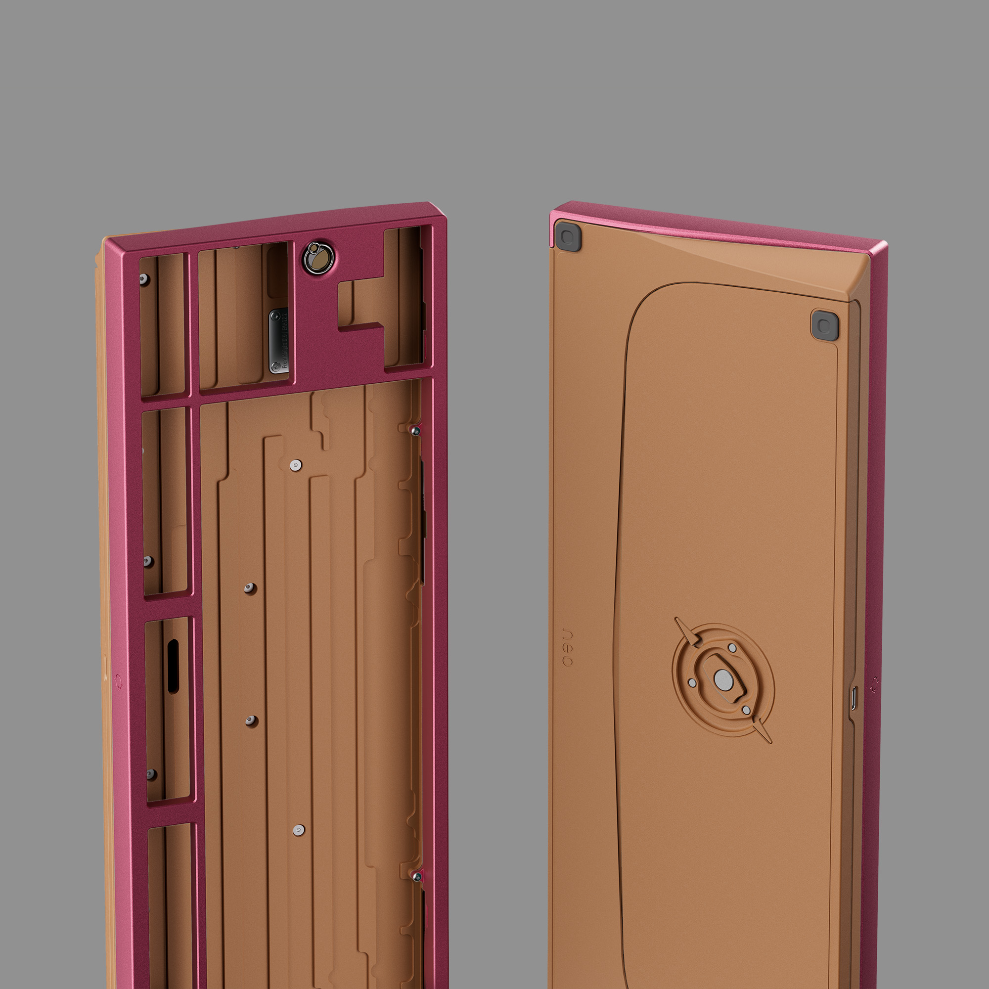 Phần đáy bàn phím thiết kế các rãnh để giảm thiểu âm rỗng. Các miếng đệm chống rung được gắn sẵn tại tất cả các điểm tiếp xúc giữa top và bot case, giúp loại bỏ tiếng tạp âm và giảm rung. Cấu trúc này, kết hợp với chất liệu đồng, tạo ra âm thanh đặc trưng trầm và sạch mà không cần đến foam, một âm thanh rất được fan Neo yêu thích.