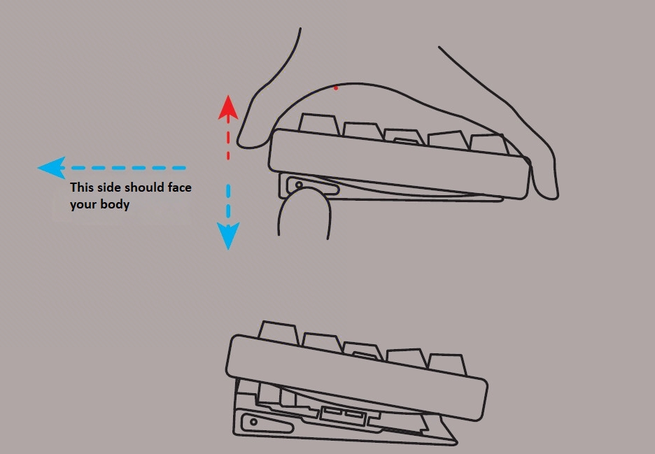 Mặc định, phím được đặt ở góc 0°. Bạn có thể nâng góc nghiêng lên 5° bằng cách giữ phần vỏ trên (top case) và kéo chân nghiêng ra.