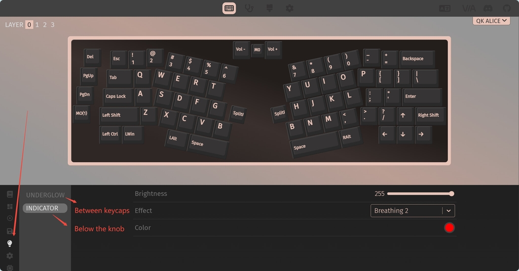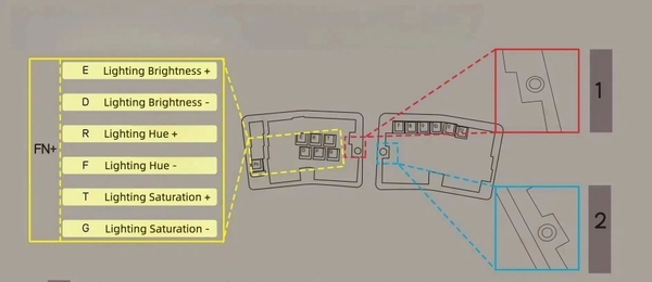 Nút bên trái dùng để thay đổi hiệu ứng của dải LED ở khe giữa và hai dải LED trang trí (cạnh phím ESC và Backspace). Bạn có thể tùy chỉnh các hiệu ứng này theo hướng dẫn tại LINK.