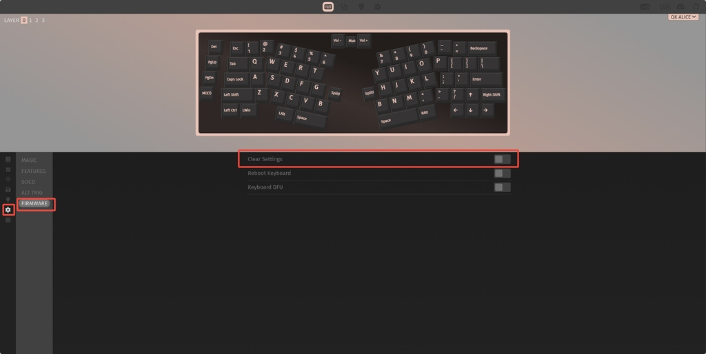 Để khôi phục cài đặt gốc bạn cần vào ⚙️ → FIRMWARE → Clear Settings. Lưu ý rằng là sau khi khôi phục cài đặt gốc bạn sẽ cần thực hiện pairing lại 2 nửa bàn phím bằng dây cáp nam châm.