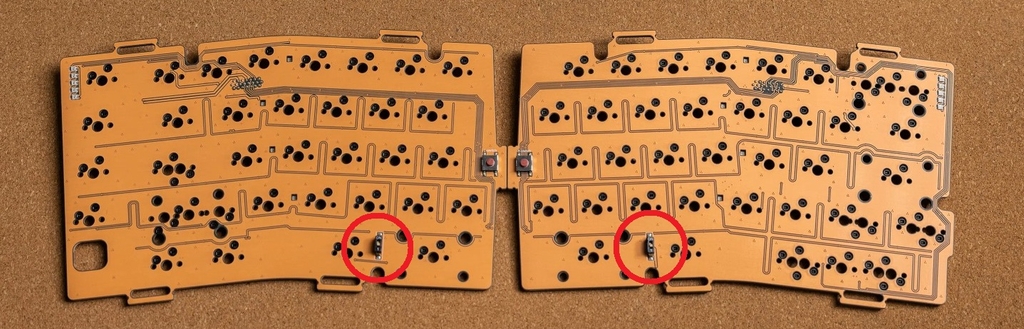 Vị trí công tắc bật pin trên PCB gần vị trí space (Bạn cần tháo keycap ra khi bật/tắt công tắc). Mỗi bên mạch sẽ có một công tắc riêng